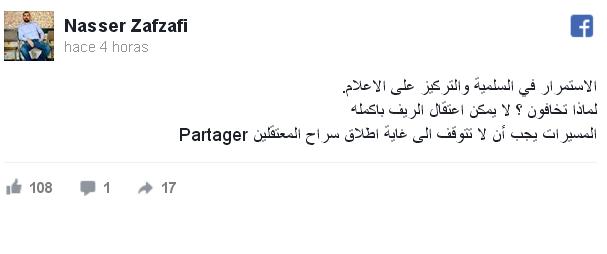بعد محاولة اعتقاله أول أمس الجمعة من طرف قوات الأمن، خرج ناصر الزفزافي في تدوينة على صفحته بالفايسبوك، اليوم الأحد ، موجها رسالة إلى نشطاء الحراك حيث قال " الاستمرار في السلمية والتركيز على الاعلام. لماذا تخافون ؟ لا يمكن اعتقال الريف باكمله. المسيرات يجب أن لا تتوقف الى غاية اطلاق سراح المعتقلين".