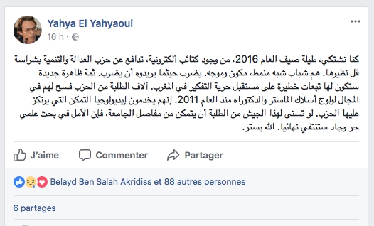 و بخصوص هذه الظاهرة التي سلط عليها الأضواء، فقد أكد اليحياوي أن : " آلاف الطلبة من الحزب فسح لهم المجال لولوج أسلاك الماستر والدكتوراه منذ العام 2011، انهم يخدمون إيديولوجيا التمكن التي يرتكز عليها الحزب، لو تسنى لهذا الجيش من الطلبة أن يتمكن من مفاصل الجامعة، فإن الأمل في بحث علمي حر وجاد سينتفي نهائيا، الله يستر".