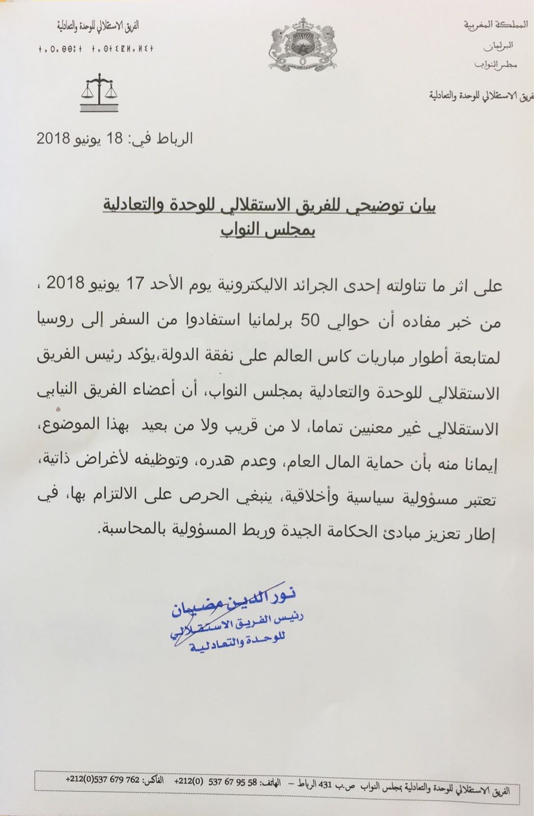 في بلاغ للرأي العام، توصل موقع " أخبارنا " بنسخة منه، أكد السيد نور الدين مضيان، رئيس الفريق الاستقلالي للوحدة و التعادلية، أن حزب الاستقلال غير معني بالأخبار التي أثارت قبيل يومين ضجة كبرى، و المتعلق بسفر 50 نائبا برلمانيا إلى روسيا على نفقة الجامعة الملكية لكرة القدم، بهدف حضور فعاليات المونديال.