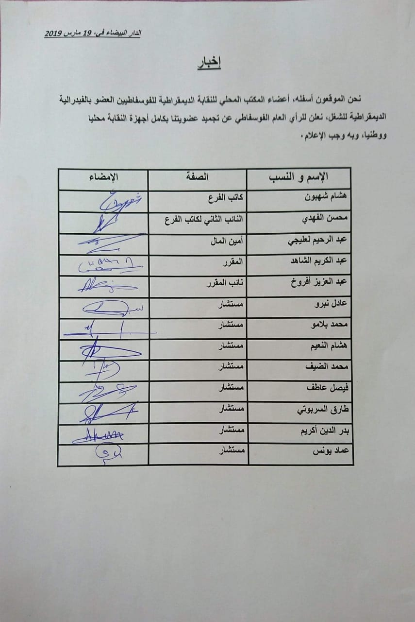توصلت "أخبارنا المغربية"، بوثائق توثق لاستقالات وانسحابات جماعية، طالت "النقابة الديمقراطية للفوسفاطيين"، التابعة لـ"الفدرالية الديمقراطية للشغل".