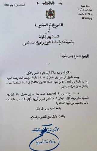 هذا يعقد وزراء مجلسا حكوميا في هذه الأثناء برئاسة سعد الدين العثماني مخصص لتدارس مشروع مرسوم 2.20.406 يقضي بتمديد حالة الطوارئ الصحية لفترة إضافية مع سن مقتضيات خاصة بالتخفيف من القيود المتعلقة بها والتي تدخل في إطار الحجر الصحي المعمول به منذ 20 من مارس الماضي، حيث ستمدد حالة الطوارئ بكافة تراب المملكة إلى غاية 8 من غشت الجاري، وبموازاة مع ذلك، ستستفيد الأقاليم الخالية من حالات الإصابة من تخفيف كبير في تدابير الحجر.
