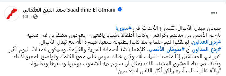 وأكد العثماني أن هذه المرحلة قد تكون بداية لبناء "مشرق جديد" تسهم فيه الشعوب بوعيها وصبرها وإخلاصها، مختتمًا تدوينته بآية قرآنية: "والله غالب على أمره ولكن أكثر الناس لا يعلمون".