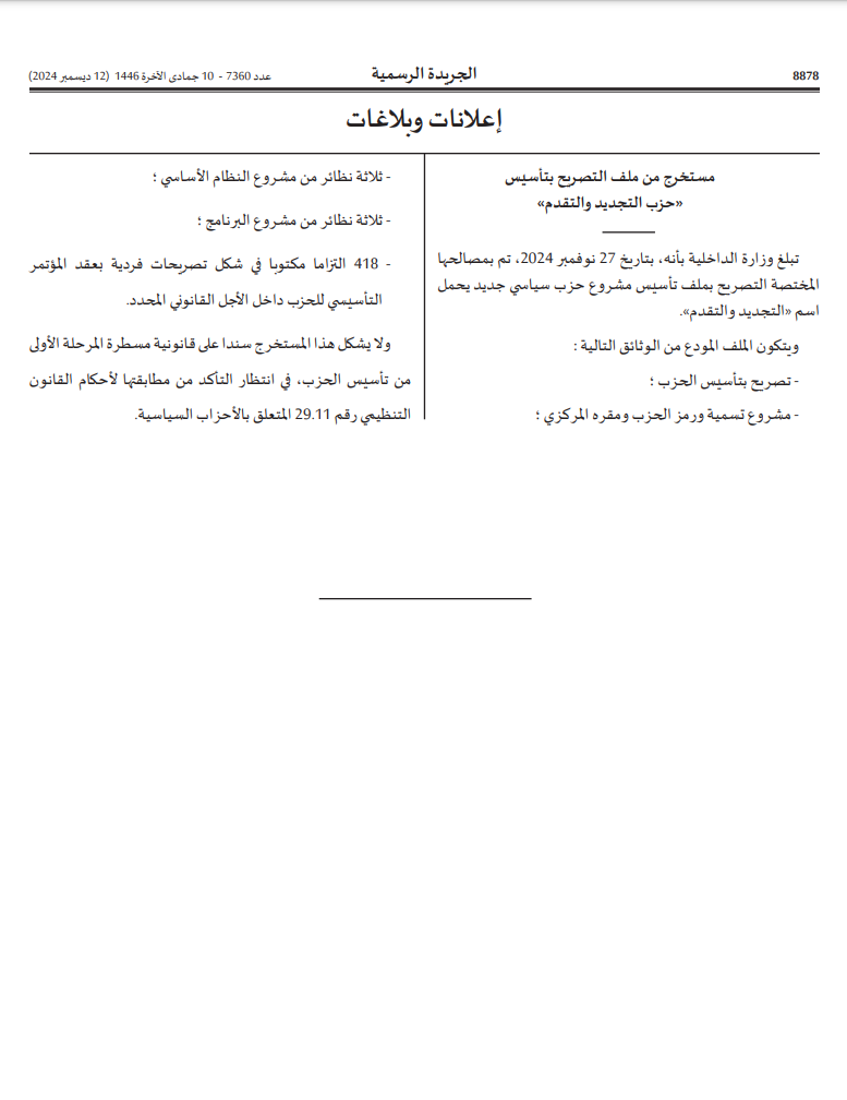أعلنت وزارة الداخلية عن تلقيها ملف تأسيس حزب سياسي جديد يحمل اسم "التجديد والتقدم"، وفقًا لما ورد في العدد 7360 من الجريدة الرسمية بتاريخ 12 دجنبر 2024.