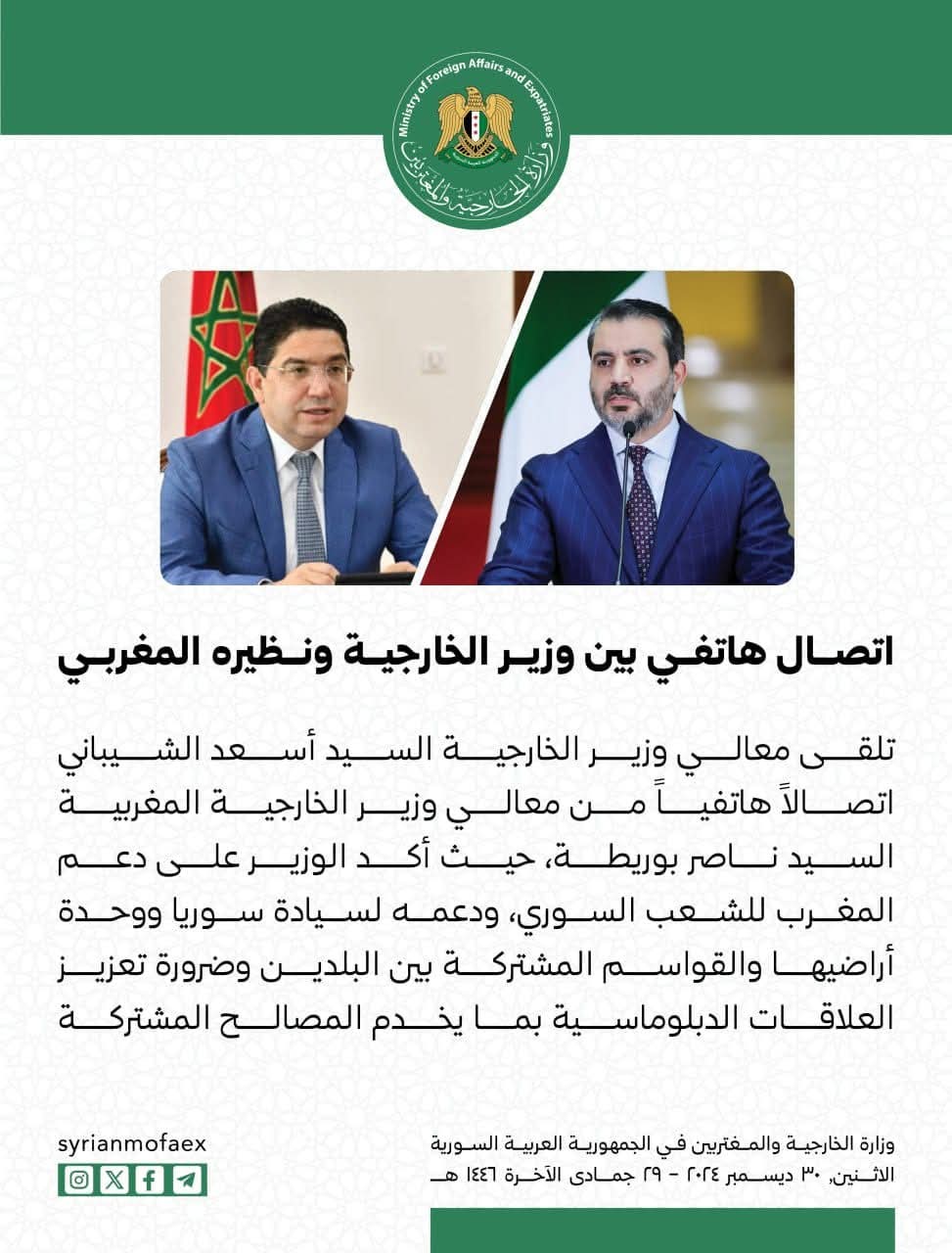 أعلنت وزارة الخارجية السورية، مساء اليوم الإثنين، عن إجراء أول اتصال هاتفي بين ناصر بوريطة، وزير الشؤون الخارجية والتعاون الإفريقي والمغاربة المقيمين في الخارج، ونظيره السوري أسعد الشيباني، بعد سنوات من التوتر في العلاقات بين البلدين في عهد نظام الرئيس المخلوع بشار الأسد .