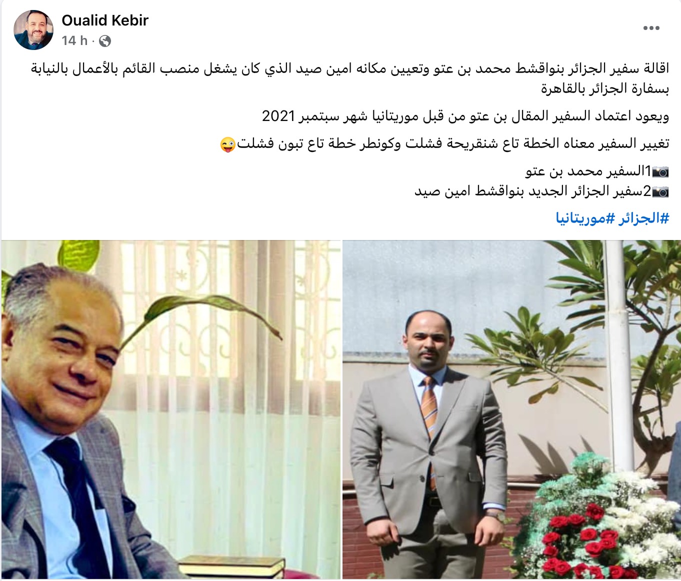 في ذات السياق، تفاعل الكاتب والصحفي الجزائري المعارض، وليد كبير، مع هذا الخبر، حيث نشر بالمناسبة تدوينة عبر حسابه الفيسبوكي، جاء فيها: "إقالة سفير الجزائر بنواكشوط محمد بنعتو، وتعويضه بأمين صيد الذي كان يشغل منصب القائم بالأعمال بالنيابة في سفارة الجزائر بالقاهرة".