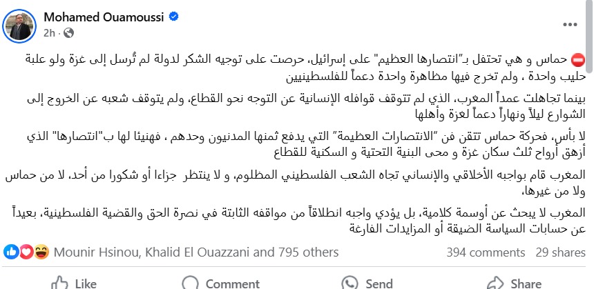 وأضاف "لا بأس، فحركة حماس تتقن فن “الانتصارات العظيمة” التي يدفع ثمنها المدنيون وحدهم ، فهنيئا لها ب"انتصارها" الذي أزهق أرواح ثلث سكان غزة و محى البنية التحتية و السكنية للقطاع"، مردفا "المغرب قام بواجبه الأخلاقي والإنساني تجاه الشعب الفلسطيني المظلوم، و لا ينتظر جزاءا أو شكورا من أحد، لا من حماس ولا من غيرها،المغرب لا يبحث عن أوسمة كلامية، بل يؤدي واجبه انطلاقاً من مواقفه الثابتة في نصرة الحق والقضية الفلسطينية، بعيداً عن حسابات السياسة الضيقة أو المزايدات الفارغة".