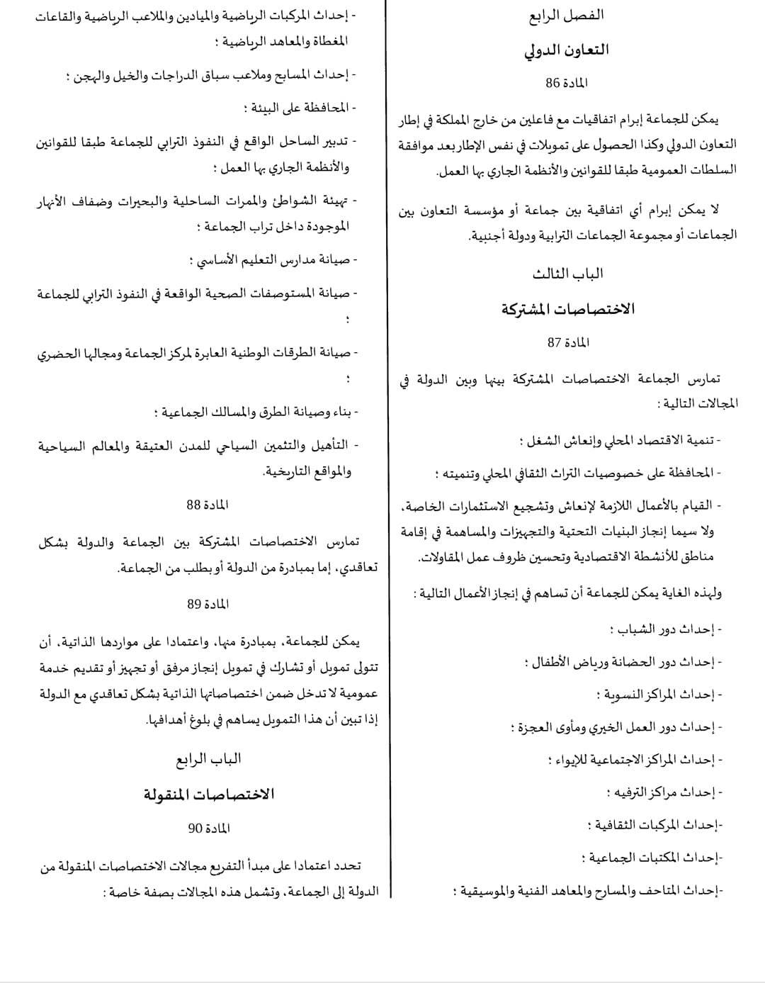 في هذا الصدد، قال "الجعفري": "إذا عدنا للقانون التنظيمي المتعلق بالجماعات المحلية والذي يعتبر امتدادا مكملا للدستور، فإن المادة 87 تبرز أهم الاختصاصات المشتركة بين الدولة والجماعات الترابية وضمنها التأهيل و التثمين السياحي للمدن العتيقة والمعالم السياحية والمواقع التاريخية"، قبل أن يؤكد أن النقل العمومي يعتبر أحد أهم الأوراش التي يمكن أن تشكل مجالا لتقديم الخدمات العمومية عبر تعاقدات مشتركة مع الدولة، وفق تعبيره.