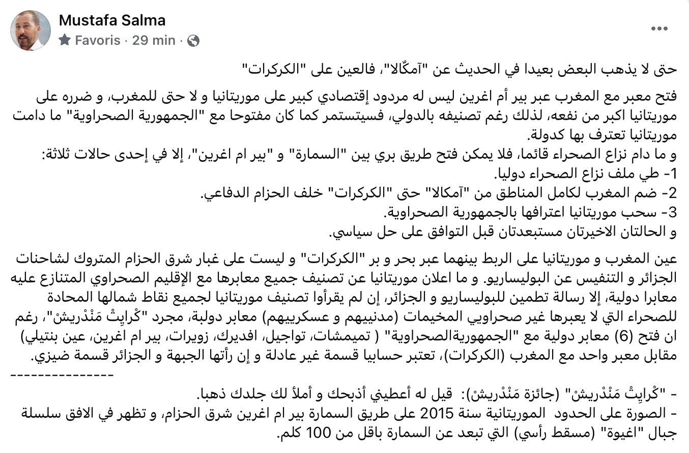 وتابع قائلا: "إن لم يقرأوا تصنيف موريتانيا لجميع نقاط شمالها المحادة للصحراء التي لا يعبرها غير صحراويي المخيمات (مدنييهم و عسكرييهم) معابر دولية، مجرد (كْرايِتْ مَنْدْريشْ)، رغم أن فتح ستة معابر دولية مع الجمهورية الصحراوية ( تميمشات، تواجيل، افديرك، ازويرات، بير ام اغرين، عين بنتيلي) مقابل معبر واحد مع المغرب (الكركرات)، تعتبر حسابيا قسمة غير عادلة وإن رأتها الجبهة والجزائر قسمة ضيزي".