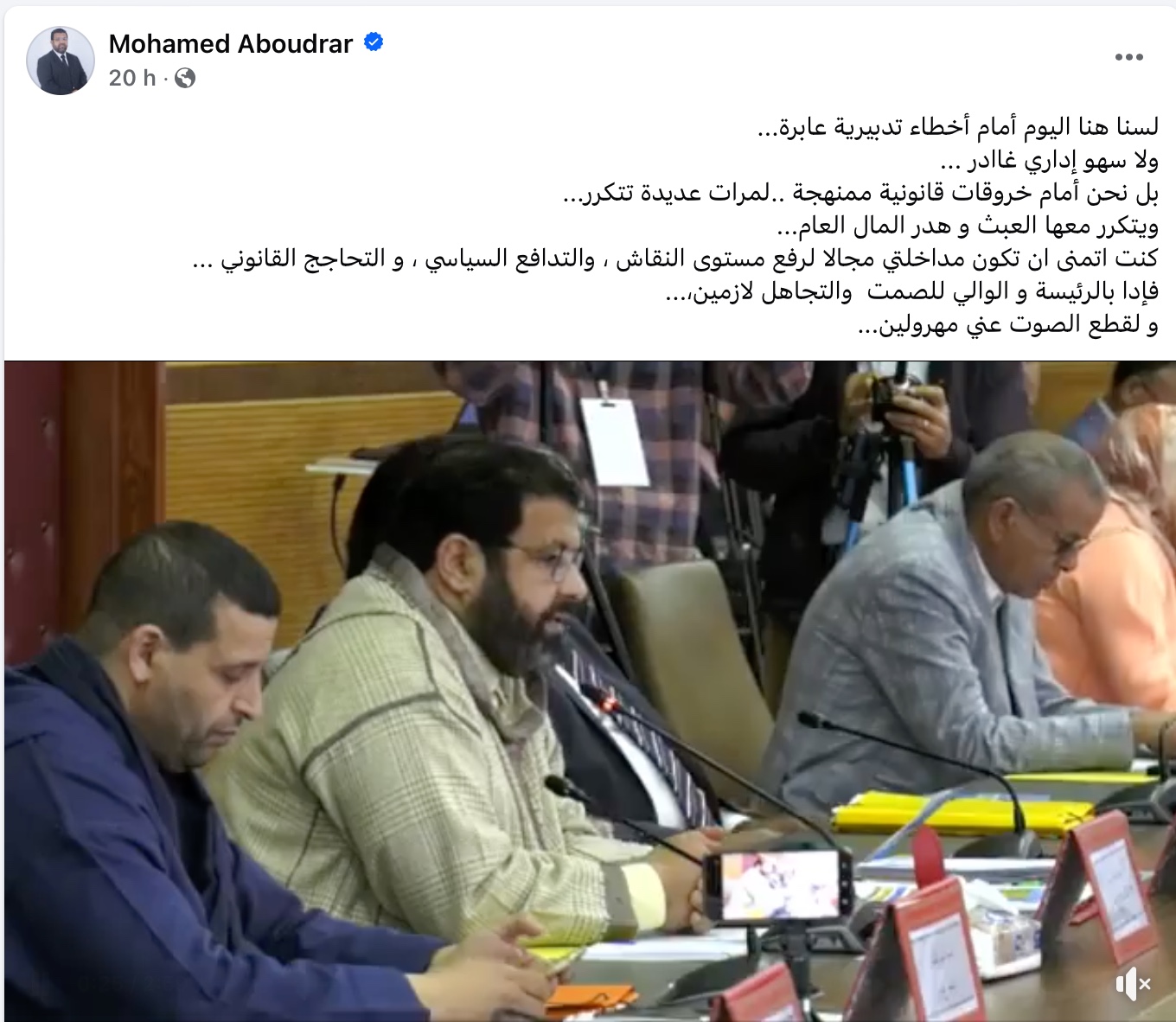 ولم يكتف المستشار المعارض "أبودرار"، المنتمي لحزب الاتحاد الاشتراكي، بالمطالبة بـ"عزل والي الجهة ورئيسة المجلس "امباركة بوعيدة، بل واصل توجيه انتقاداته المعتادة من خلال تدوينة جديدة نشرها عبر حسابه الفيسبوكي، جاء فيها: "لسنا هنا اليوم أمام أخطاء تدبيرية عابرة، ولا سهو إداري غادر، بل نحن أمام خروقات قانونية ممنهجة، تكررت لمرات عديدة، كما يتكرر معها العبث وهدر المال العام"، قبل أن يؤكد قائلا: "كنت اتمنى ان تكون مداخلتي مجالا لرفع مستوى النقاش والتدافع السياسي والتحاجج القانوني، فإذا بالرئيسة والوالي يلتزمان أسلوب الصمت والتجاهل، بل و يلجأن إلى قطع الصوت عني".