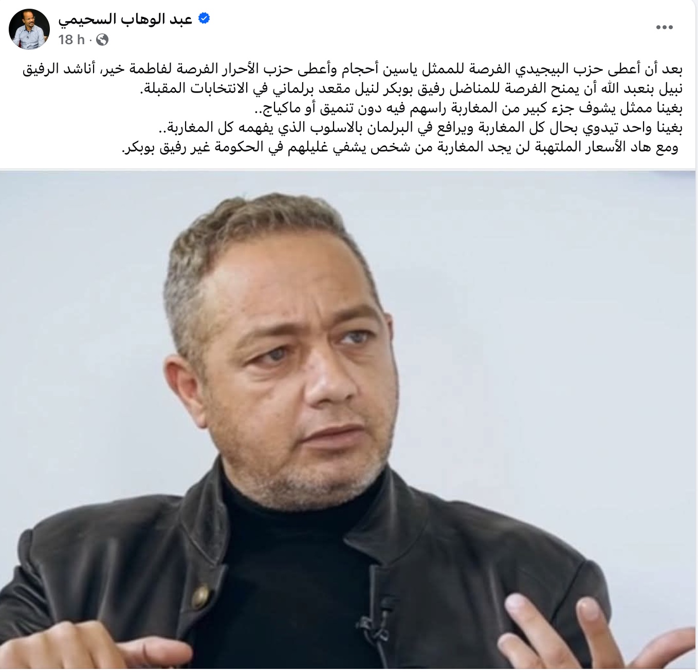 وتابع "السحيمي" قائلاً: "بغينا ممثل يشوف جزء كبير من المغاربة راسهم فيه دون تنميق أو ماكياج.. بغينا واحد تيدوي بحال كل المغاربة ويرافع في البرلمان بالأسلوب الذي يفهمه كل المغاربة.. ومع هاد الأسعار الملتهبة لن يجد المغاربة من شخص يشفي غليلهم في الحكومة غير رفيق بوبكر".