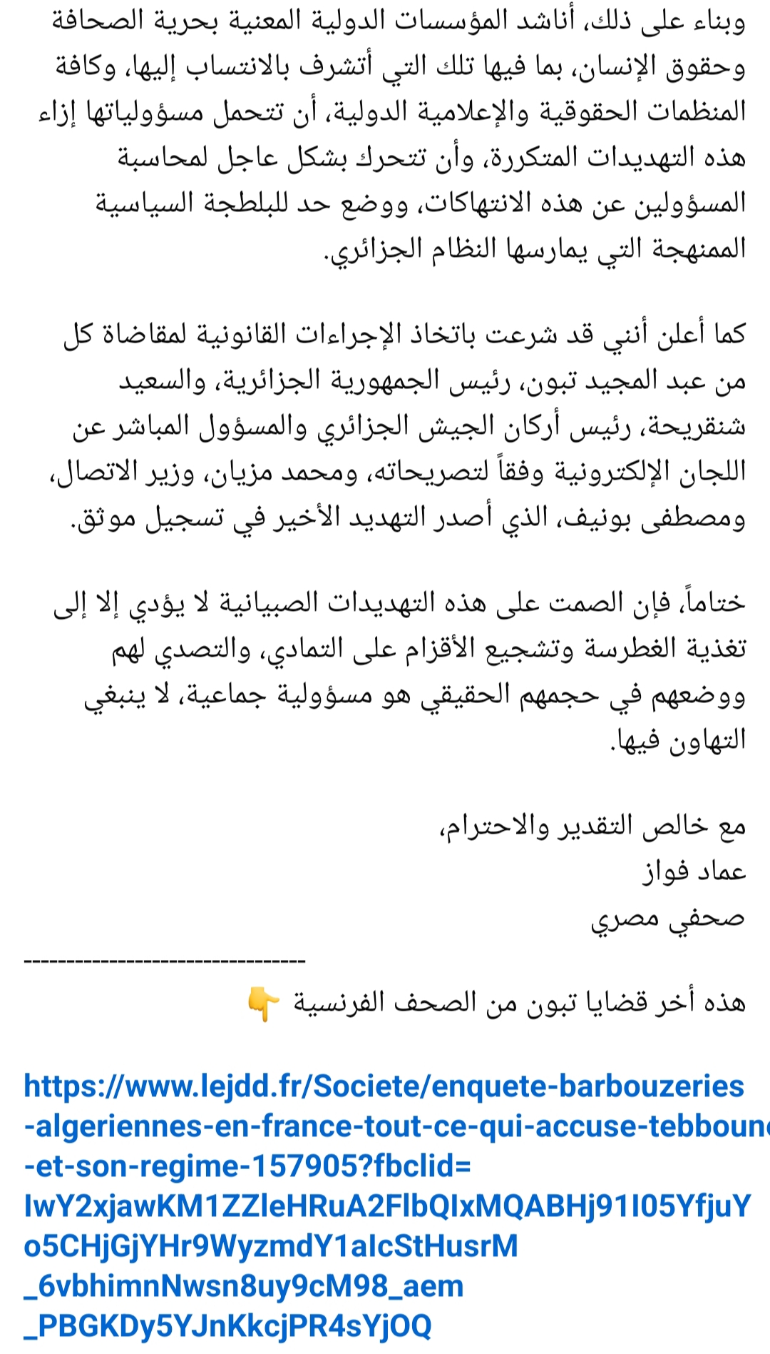 في بيان للرأي العام أثار تفاعلًا واسعًا، كشف الصحفي المصري عماد فواز، عضو نقابة الصحفيين المصريين واتحاد الصحفيين العرب والاتحاد الدولي للصحفيين، عن تعرضه لسلسلة من التهديدات المباشرة من النظام الجزائري، ممثلًا برئيسه عبد المجيد تبون وأذرعه الإعلامية والإلكترونية.