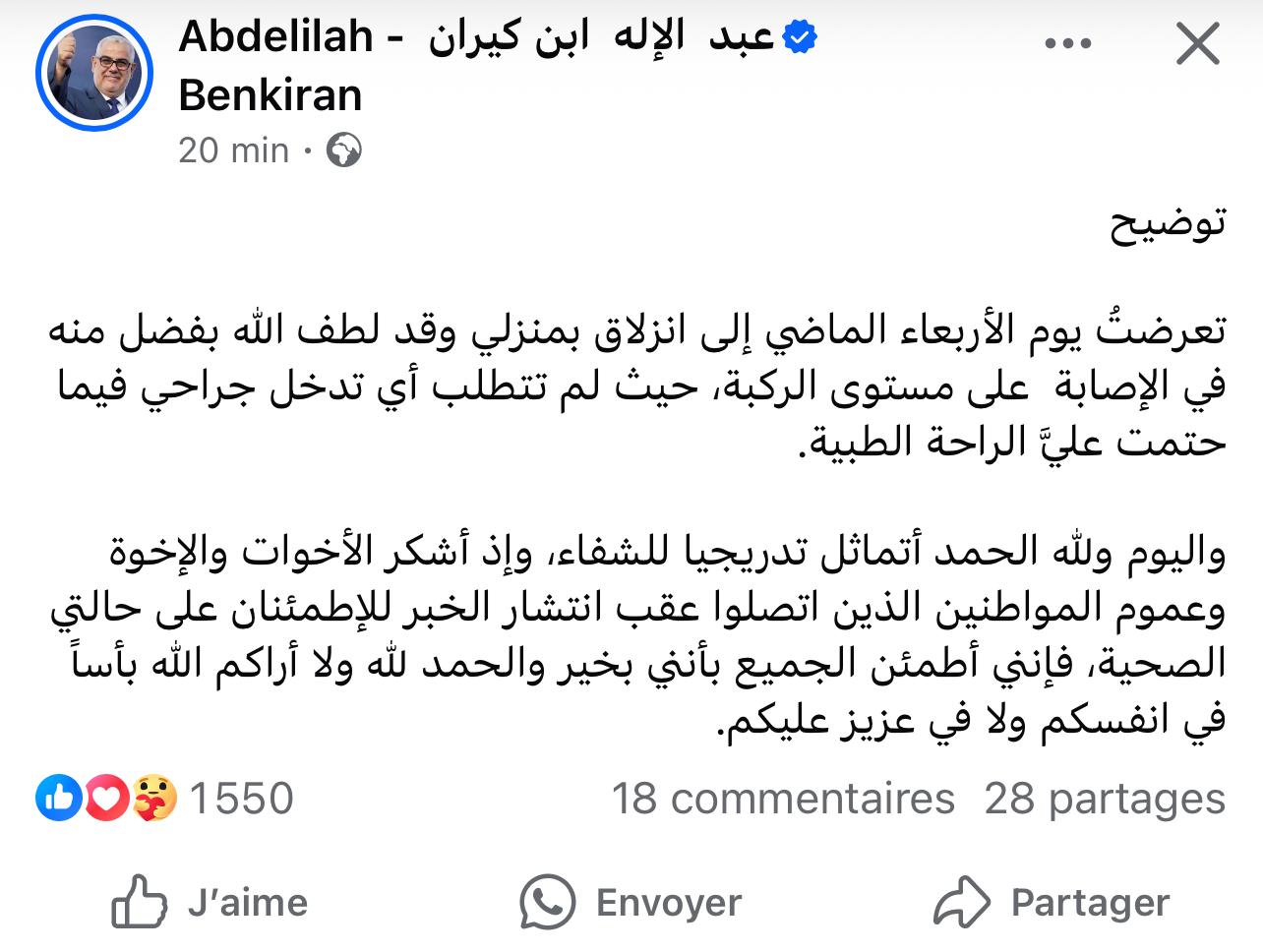 وأوضح ابن كيران في منشوره: "تعرضتُ يوم الأربعاء الماضي إلى انزلاق بمنزلي وقد لطف الله بفضل منه في الإصابة على مستوى الركبة، حيث لم تتطلب أي تدخل جراحي فيما حتمت عليَّ الراحة الطبية".