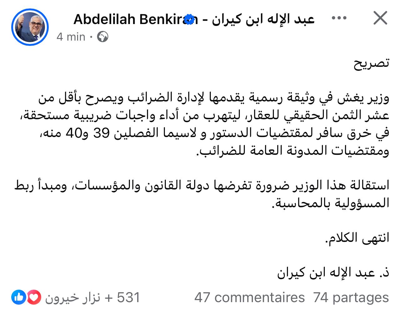 واعتبر بنكيران، في تدوينة نشرها على صفحته الرسمية، أن ما قام به هذا الوزير يشكل خرقا سافرا لمقتضيات الدستور، خاصة الفصلين 39 و40، وكذا للقوانين الجاري بها العمل، وعلى رأسها المدونة العامة للضرائب، داعيا إلى ضرورة تفعيل مبدأ ربط المسؤولية بالمحاسبة.