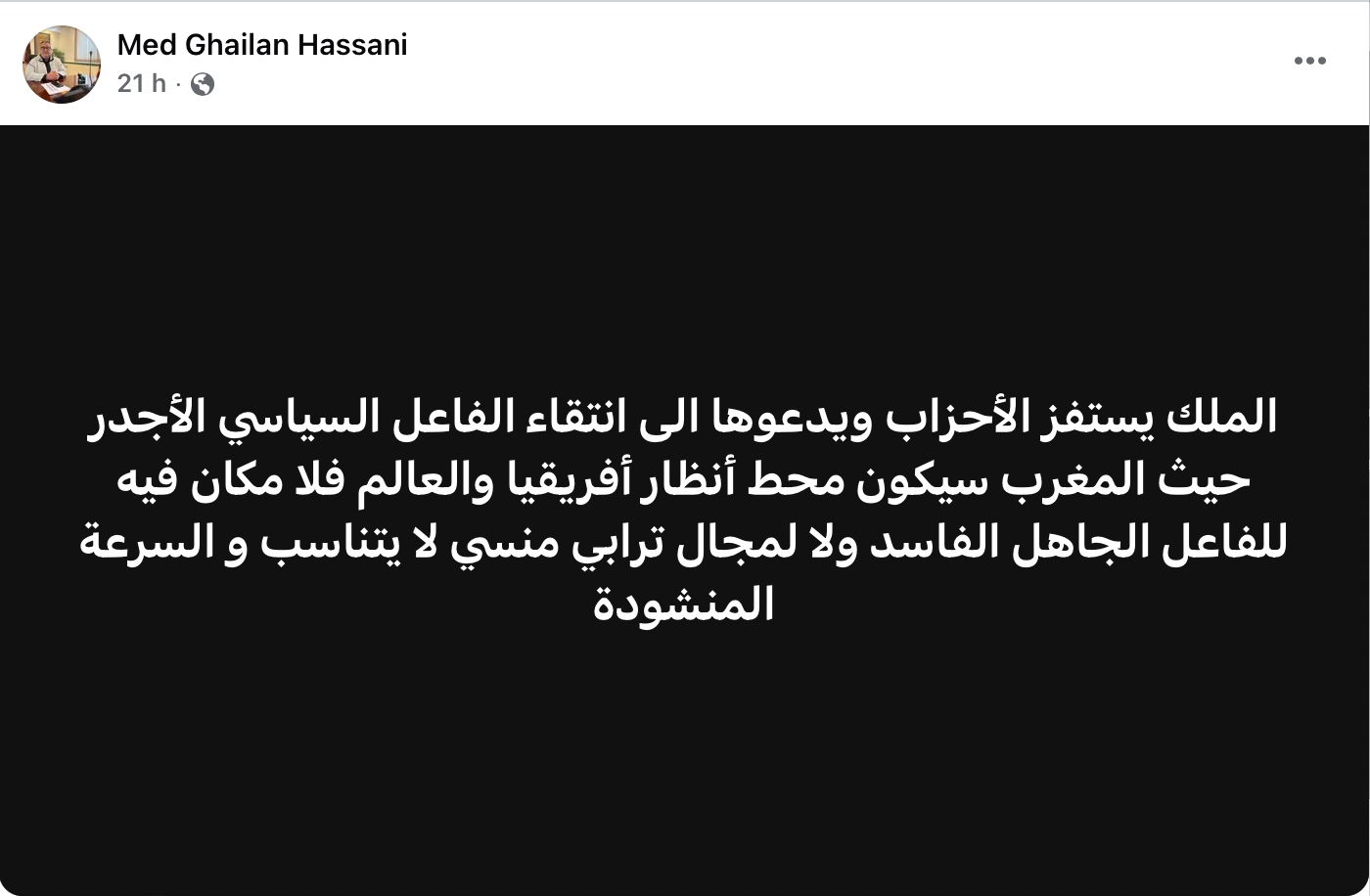أثارت تدوينة نشرها "محمد غيلان"، نائب عمدة مدينة طنجة، والمنتمي لحزب التجمع الوطني للأحرار -أثارت- جدلًا لافتًا في أوساط المتتبعين للشأن السياسي، وذلك بعد أن وصف خطاب الملك محمد السادس بمناسبة عيد العرش بكونه "يستفز الأحزاب"، داعيًا إياها إلى انتقاء الفاعلين السياسيين الأجدر، بما يليق بمغرب يتأهب لمرحلة سيكون فيها محط أنظار القارة الإفريقية والعالم.