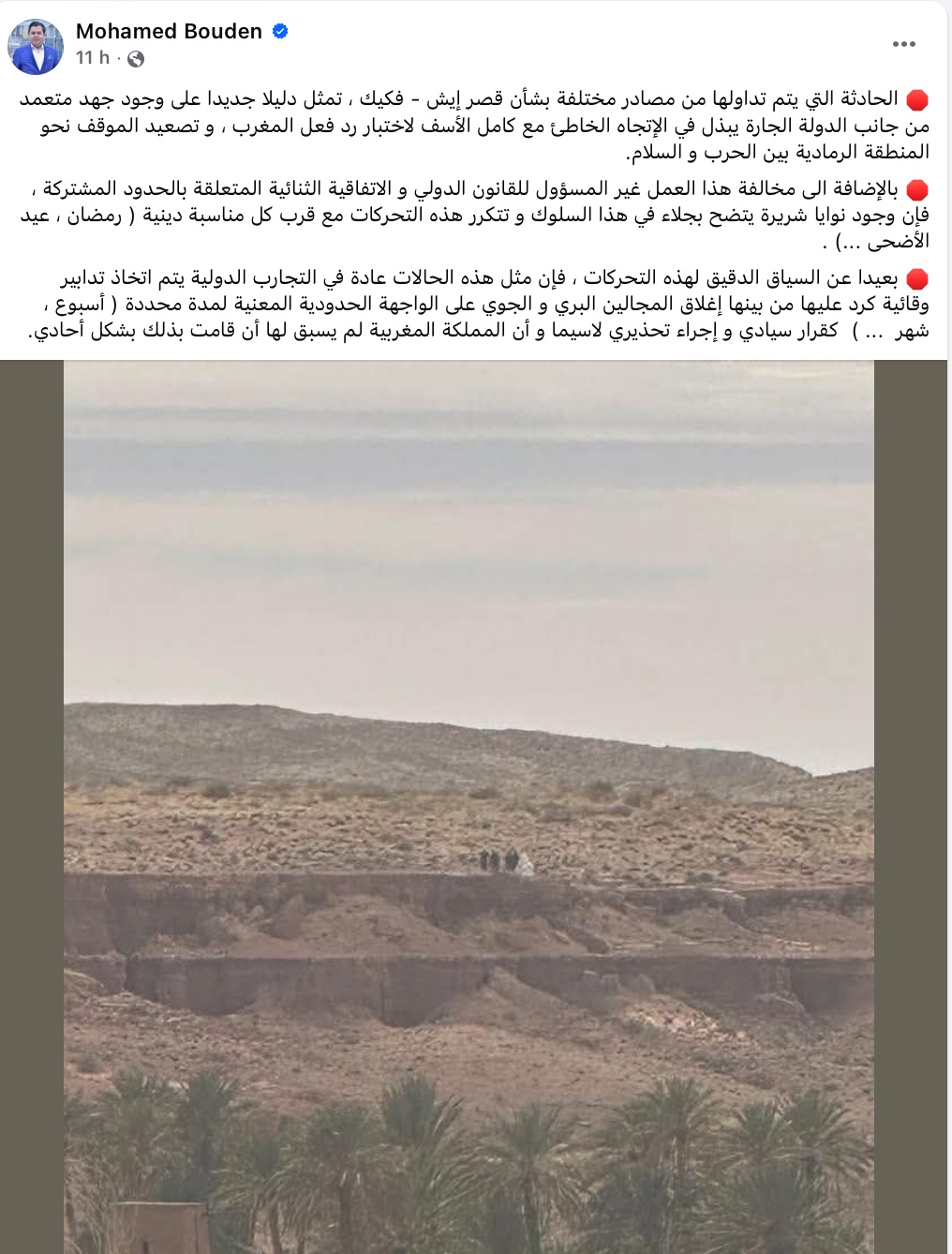 في هذا السياق، شدد الدكتور "محمد بودن"، رئيس مركز أطلس للدراسات الاستراتيجية، على أن حادثة قصر إيش تمثل دليلاً جديداً على الجهد المتعمد من الدولة الجارة في الاتجاه الخاطئ، بهدف اختبار ردود فعل المغرب وتصعيد الموقف نحو المنطقة الرمادية بين الحرب والسلام.