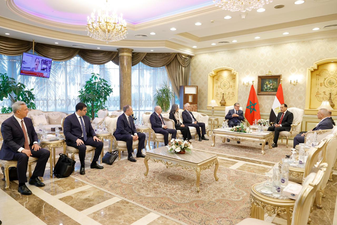 ووجد عزيز أخنوش في استقباله رئيس مجلس الوزراء المصري مصطفى مدبولي، ووزير الاستثمار والتجارة الخارجية محمد فريد صالح.
