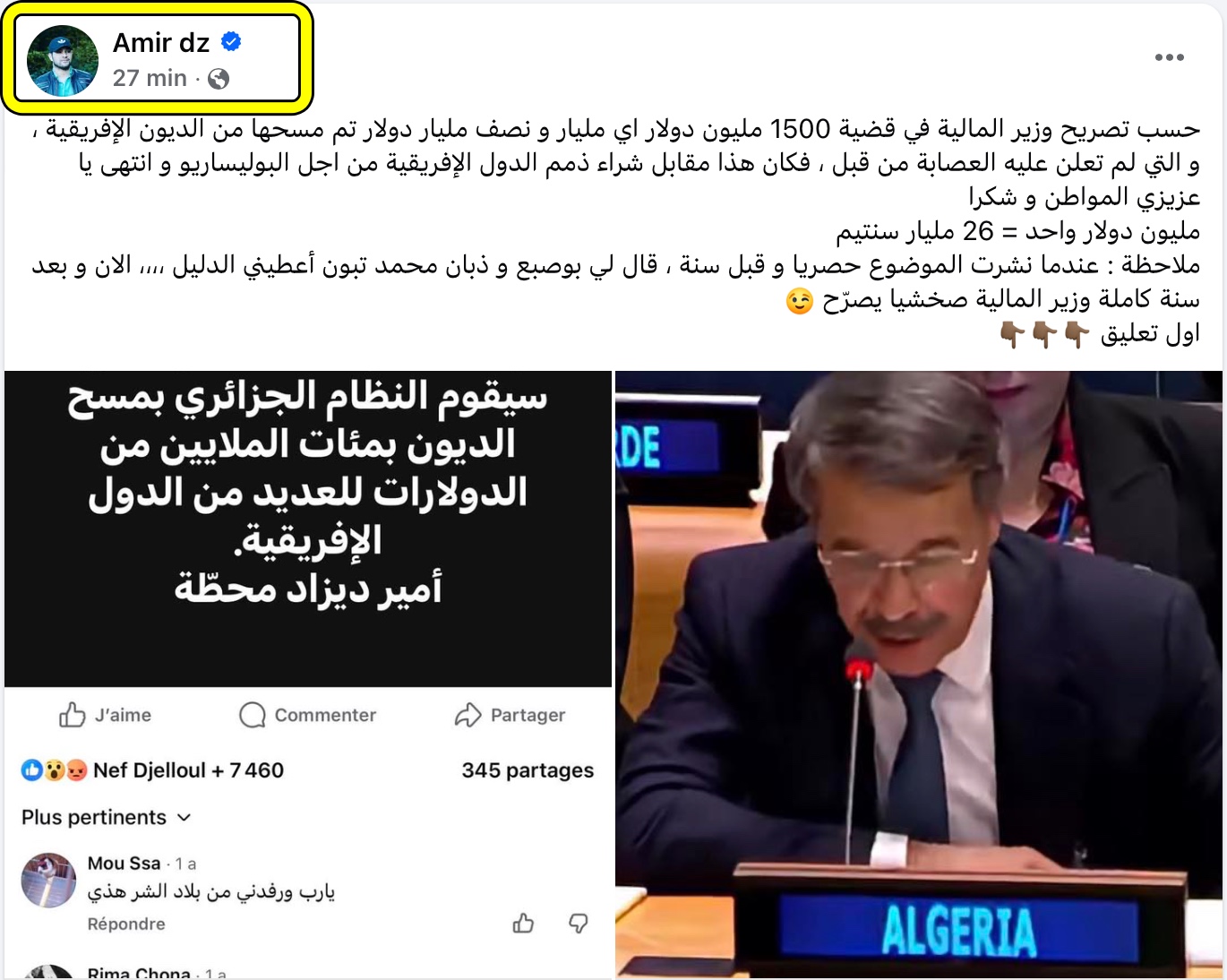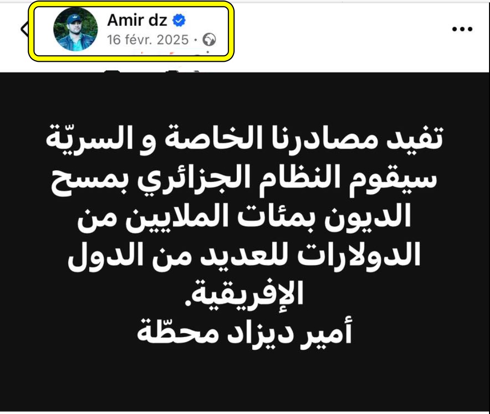 وجاء تصريح وزير المالية ليؤكد أن الجزائر قامت بإلغاء ديون تقدر بمليار ونصف مليار دولار لفائدة دول إفريقية، في إطار ما اعتُبر سياسة لدعم التنمية في القارة وتخفيف الأعباء المالية عن بعض الدول. غير أن عودة "أمير بوخريص" إلى الموضوع عبر تدوينة جديدة على صفحته الفيسبوكية أضفت بعدًا جدليًا جديدًا، بعدما شدد على أنه كان قد نشر المعلومة نفسها قبل عام كامل، في وقت طُلب منه حينها تقديم الأدلة، قبل أن يتبين لاحقًا أن المعطى أصبح رسميًا على لسان وزير المالية.