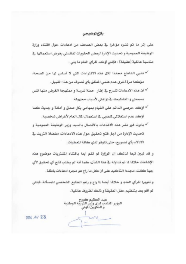 وبين الوزير أنه إتصل بخليفته على رأس الوزارة، وطلب فتح تحقيق بهذا الشأن، تبين على إثره "أن الوزارة لم تقم أبدا باقتناء المشتريات موضوع الإشاعات"، ومضيفا أنه لم يقم بعد بتنظيم حفل عقيقة إبنه بعد أيضا لظروف وصفها بالعائلية.