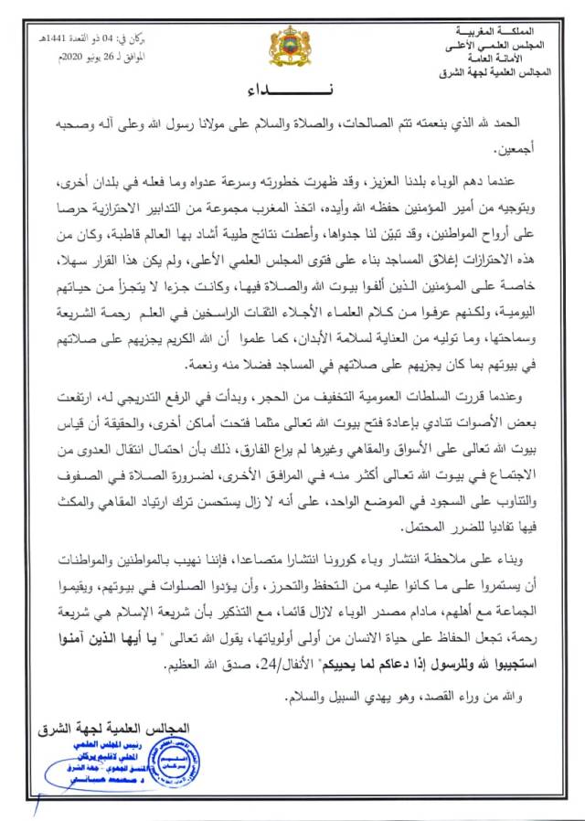 أصدرت المجالس العلمية لجهة الشرق نداءً حول استمرار إغلاق المساجد في ظل ظرفية كورونا، وذلك تزامنا مع تعالي الأصوات المطالبة بفتحها بعد دخول المرحلة الثانية من تخفيف الحجر الصحي والسماح بفتح المقاهي والأسواق وعدد من المرافق، بعد تصنيف عدد من العمالات والأقليم ضمن المنطقة رقم 1.