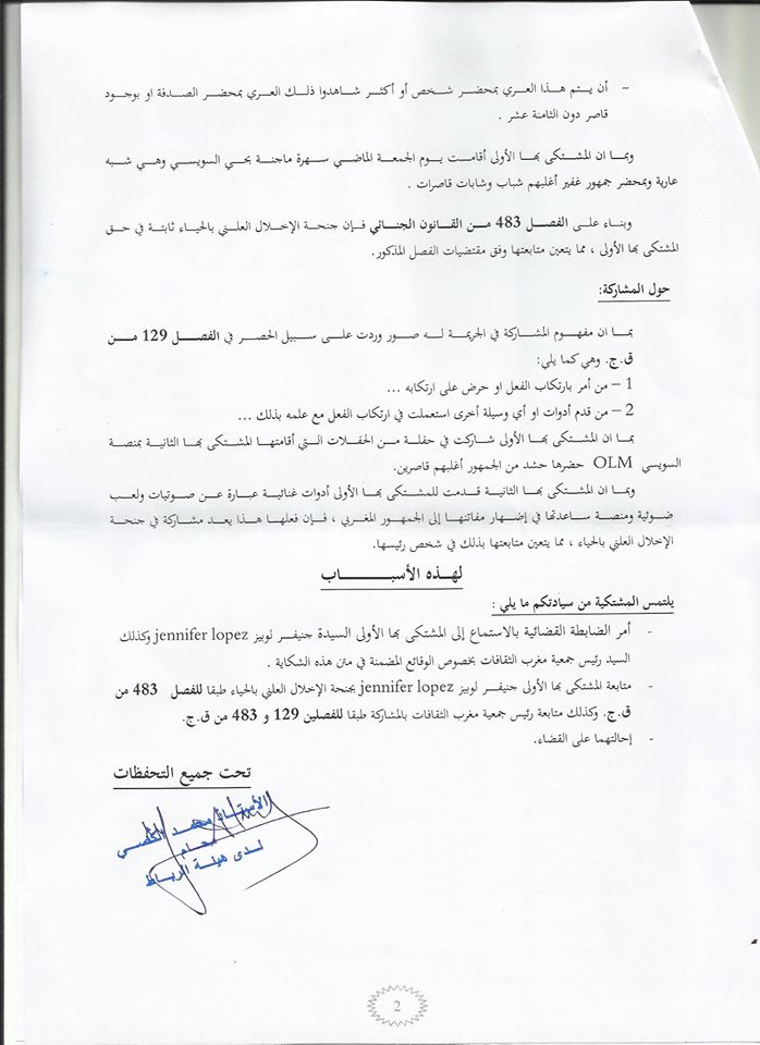 و استند المشتكي إلى الفصلين 483 و 129 من القانون الجنائي المغربي وفق ما ورد في الشكاية القضائية ، التي جاء فيها "بعد مدة صعدت إلى المنصة امرأة في الأربعينات من عمرها بمعية مجموعة من الراقصين والراقصات يرتدين لباسا كاشفا لأجسامهن ومخلا بالحياء، حيث قامت بتقديم وصلات ومقاطع غنائية يغلب عليها البذاءة في الإشارات والأفعال، تمت متابعتها من طرف جمهور حاشد أغلبهم شباب وقاصرات".