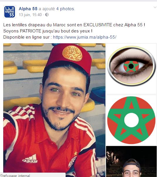 قام أحد المتاجر بالدارالبيضاء، بطرح عدسات لاصقة تحمل ألوان العلم الوطني، يبلغ ثمنها 249 درهما، وهي صالحة لمدة سنة، وفق اعلان الشركة المنتجة على صفحتها الرسمية بموقع الفايسبوك.