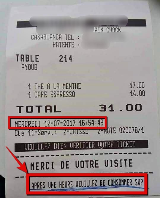 تداول نشطاء بالفيسبوك ، صورة مثيرة للجدل ، لفاتورة مقهى توجد بمدينة الدار البيضاء ، و بالضبط بعين الشق ، حيث يطالب صاحب المقهى زبانه بضرورة تجديد " الكونسوماسيون " أو المشروب بعد مضي ساعة على جلوسه بالمقهى .