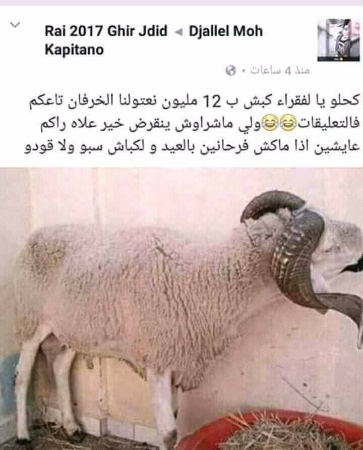 انتشرت على مواقع التواصل الاجتماعي بالجزائر ظاهرة مثيرة للجدل قبل عيد الاضحى المبارك، حيث يقوم عدد من نشطاء الفايسبوك بنشر صور خرفانهم و التباهي باعلان اثمنتها.