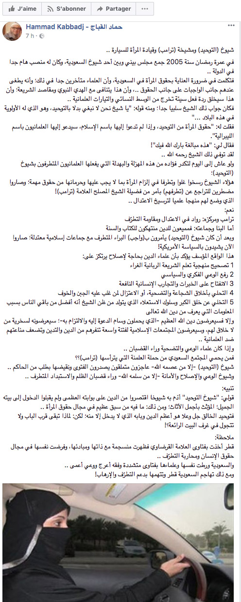 و أكد قباج في نفس التدوينة أن :"هؤلاء الشيوخ رسخوا غلوا وتطرفا في إلزام المرأة بما لا يجب عليها وحرمانها من حقوق مهمة” في إشارة لقرار السماح بقيادة السيارة للنساء؛ مضيفاً بالقول : ” وصاروا مضطرين للتراجع عن (تطرفهم) بأمر من فضيلة الشيخ المصلح العلامة (ترامب)! الذي وضع لهم منهجا علميا لترسيخ الاعتدال .. نعم: ترامب ومركزه: رواد في الاعتدال ومقاومة التطرّف أما البنا وجماعته: فمميعون للدين منتهكون للكتاب والسنة وبعد أن كان شيوخ (التوحيد) يأمرون ب(واجب) البراء المتطرف مع جماعات إسلامية معتدلة؛ صاروا الآن يشيدون بالسياسة الأمريكية! “."