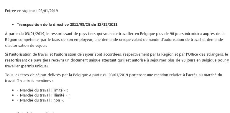 ذات المصادر أوضحت أن الامر يتعلق بتوجيهات مصادق عليها من طرف الاتحاد الاوروبي سنة 2011 ، تأخرت بلجيكا كثيرا في تطبيقها، وترتبط بمنح رخصة موحدة (Permis Unique) للمواطنين الاجانب القادمين من دول غير أوروبية والتي تربطها اتفاقيات مع بلجيكا، تجمع بين تصريحي العمل و الاقامة.