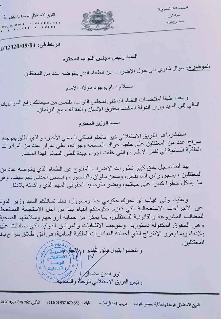 وشدد الفريق الاستقلالي على أنه: "في غياب أي تحرك حكومي جاد ومسؤول، فإننا نسائلكم السيد وزير الدولة عن الإجراءات الاستعجالية التي تعتزم حكومتكم القيام بها من أجل الاستجابة المستعجلة للمطالب المشروعة والقانونية للمعتقلين، بما يمكن من حماية أرواحهم وسلامتهم الصحية، وهي الحقوق المكفولة دستوريا، وبموجب الاتفاقيات والمواثيق الدولية التي صادقت عليها بلادنا، وبما يعزز الانفراج الذي أحدثته المبادرات الملكية السامية، في أفق إطلاق سراح باقي المعتقلين".