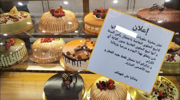 وكتب صاحب المخبز إعلان جاء فيه : “تعلن المخبزة أنها لا تبيع الحلوى الخاصة باحتفال رأس السنة، وأنها تبيع الحلوى العادية بدون كتابة أي شيئ يتعلق بهذا اليوم ومرحبا بزبنائنا الكرام ونذكركم أننا نحتفل فقط بعيد الفطر وعيد الأضحى المبارك”.