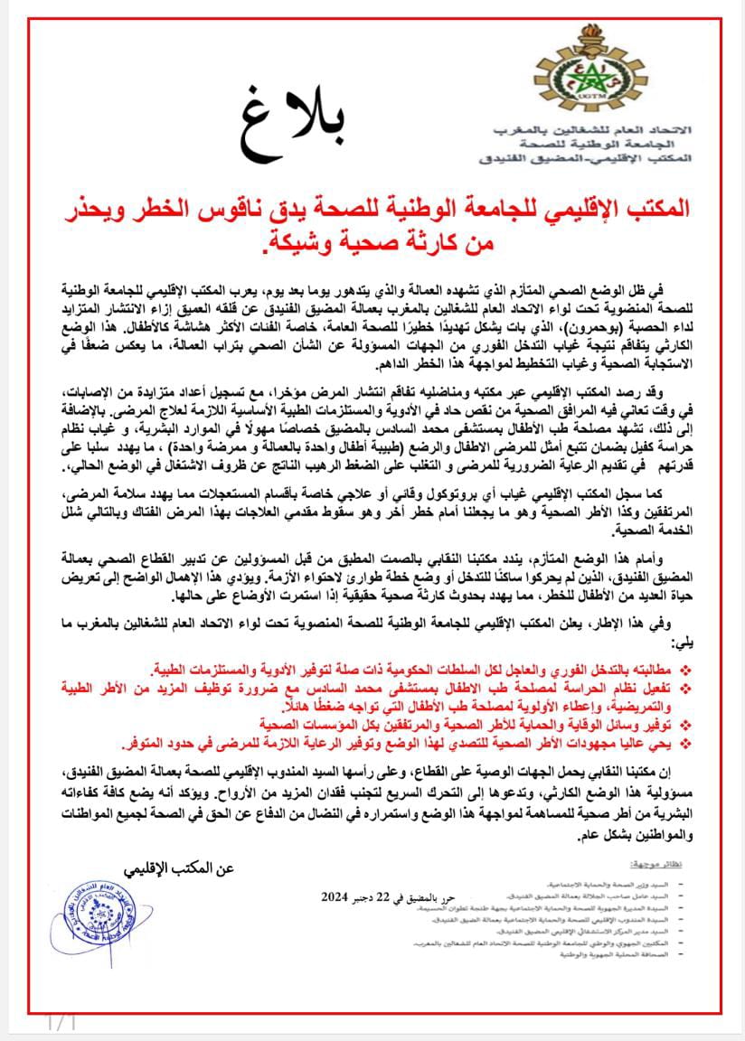 وندد المكتب النقابي في معرض البلاغ بالصمت المطبق من قبل المسؤولين عن تدبير القطاع الصحي بعمالة المضيق الفنيدق، مؤكدًا أن هذا الإهمال الواضح يعرض حياة العديد من الأطفال للخطر ويهدد بحدوث كارثة صحية حقيقية إذا استمرت الأوضاع على حالها.