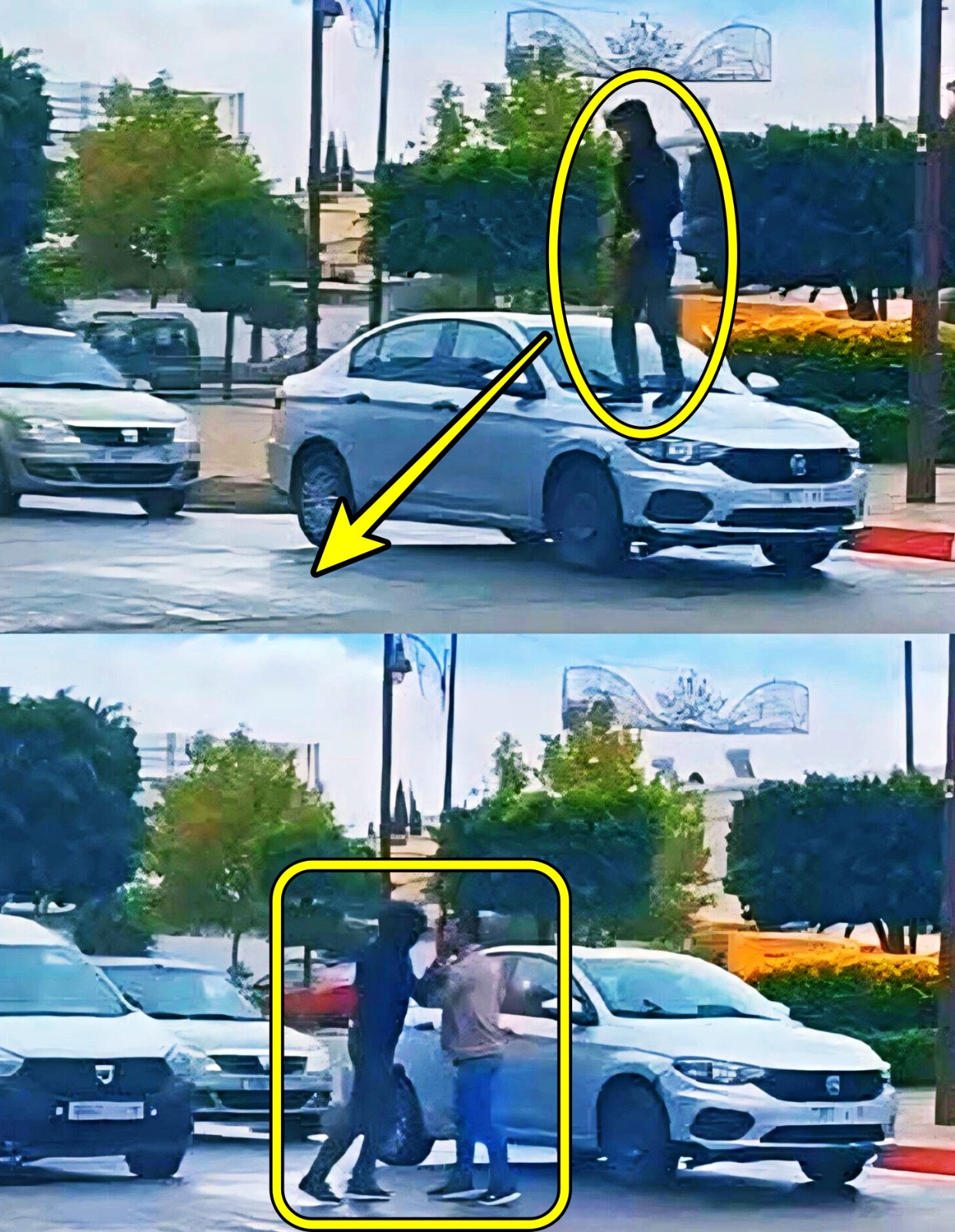 وكما توضح الصور، قرر شاب في الثلاثينيات من عمره، الصعود فوق الواجهة الأمامية لسيارة خفيفة، بعد أن توقفت خلال الإشارة الضوئية (اللون الأحمر)، فوق ممر الراجلين، ما اعتبره تجاوزا غير قانوني، عمد عقبه إلى نهج هذا السلوك، كنوع من الاحتجاج على سائق السيارة، بسبب تراميه على المساحة المخصصة للراجلين.