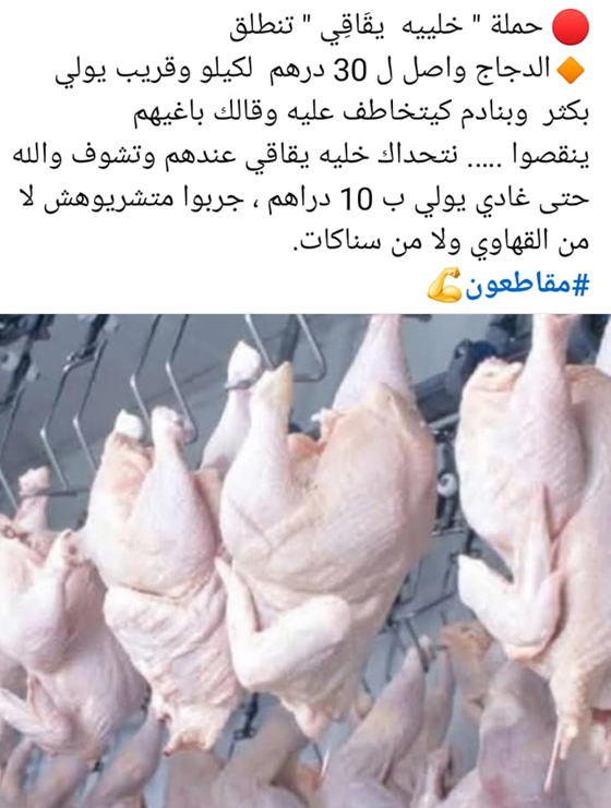 إحدى المنشورات التي اطلعت عليها "أخبارنا" جاء فيها: "حملة *خليه يقاقي* تنطلق"، "الدجاج واصل لـ30 درهما للكيلو وقريب يولي بكثر، وبنادم كيتخاطف عليه، وقالك باغيهم ينقصوا... نتحداك، خليه يقاقي عندهم وتشوف، والله حتى غادي يولي بـ10 دراهم. جربوا متشريوهش لا من القهاوي ولا من السناكات. #مقاطعون".