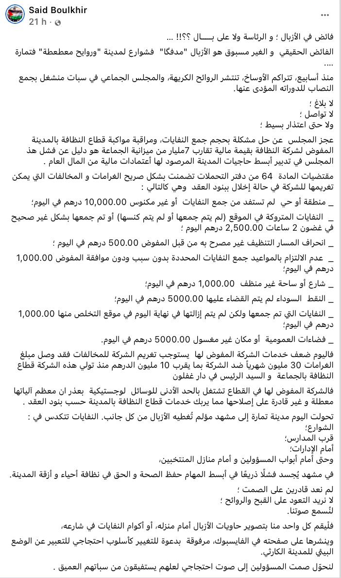 وقد سبق لموقع "أخبارنا" أن تطرق لهذا الموضوع في مقال نشر أمس الخميس، سلط فيه الضوء على تفاقم الوضع البيئي، ونقل غضب المواطنين إلى جانب الإشارة إلى تدوينة قوية للمستشار الجماعي السابق "سعيد بولخير" عن حزب العدالة والتنمية، الذي اعتبر ما يجري "عجزًا فاضحًا عن تدبير قطاع حيوي"، متهمًا المجلس الجماعي بالتقاعس و"الانشغال بجمع النصاب لدوراته المؤدى عنها بدل معالجة الكارثة التي تعيشها المدينة".