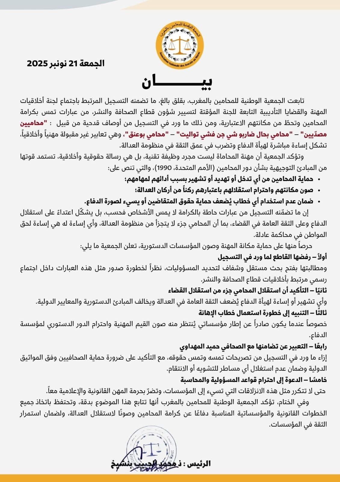 أصدرت الجمعية الوطنية للمحامين بالمغرب بيانا شديد اللهجة أعربت فيه عن قلقها البالغ إزاء ما تضمنه تسجيل اجتماع لجنة أخلاقيات المهنة والقضايا التأديبية التابعة للجنة المؤقتة لتسيير شؤون قطاع الصحافة والنشر من عبارات مسيئة تمس بكرامة المحامين وتقلل من مكانتهم الاعتبارية.