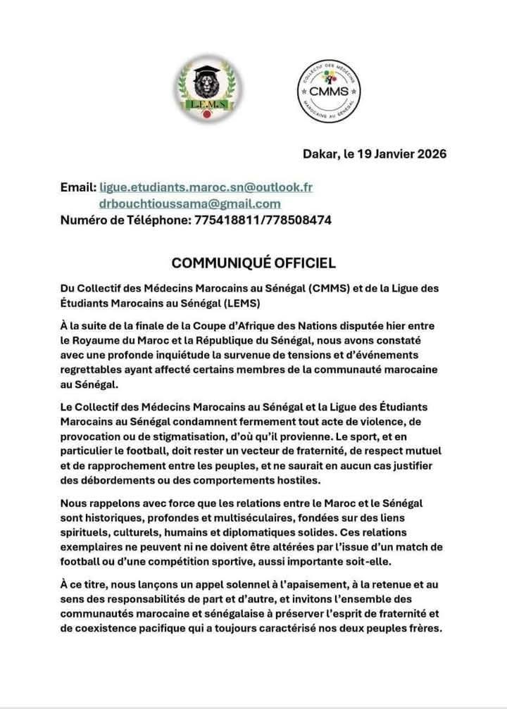 دعا تجمع الأطباء المغاربة بالسنغال ورابطة الطلبة المغاربة في بلاغ رسمي، إلى ضبط النفس والتحلي بروح المسؤولية، عقب التوترات التي أعقبت نهائي كأس أمم إفريقيا بين المغرب والسنغال، والتي طالت بعض أفراد الجالية المغربية هناك.