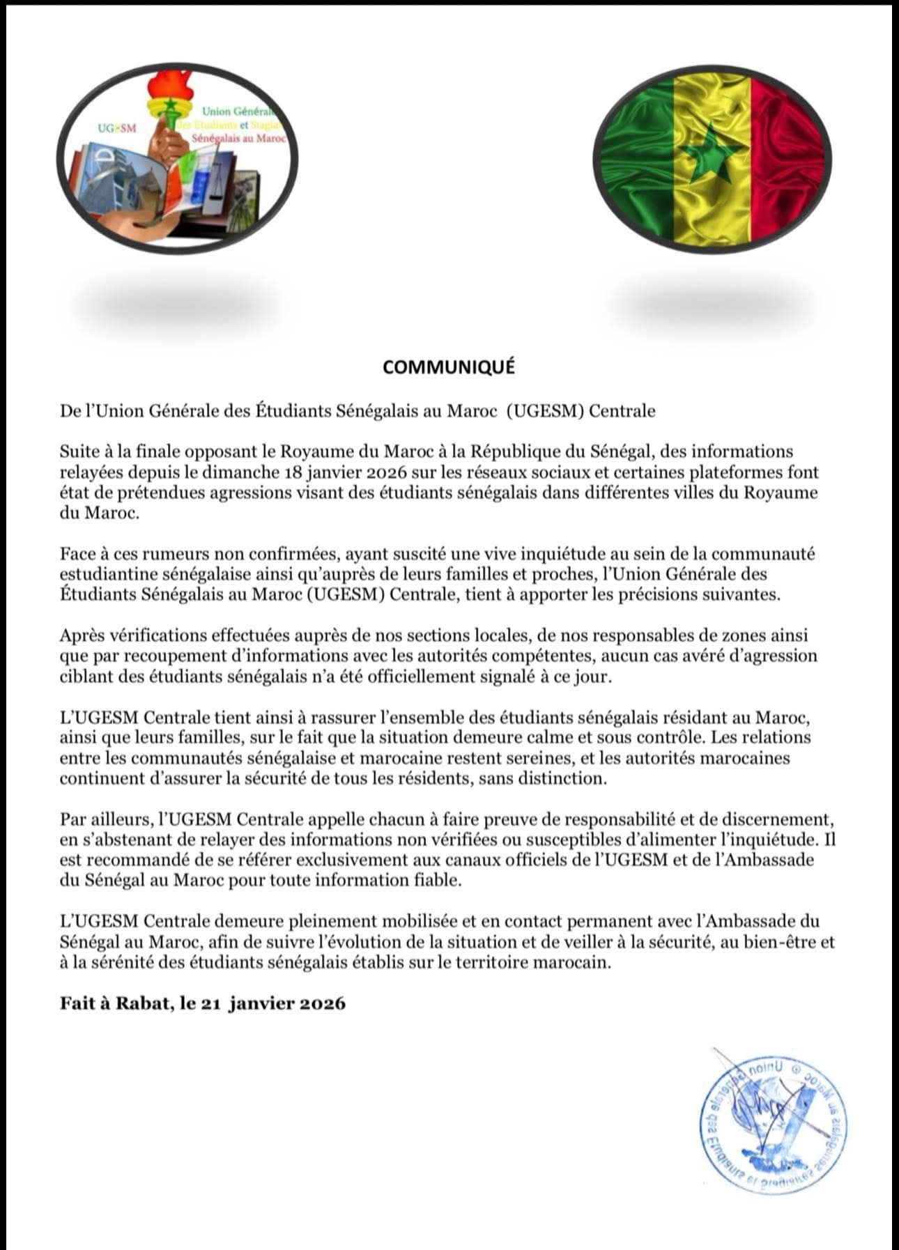 ودعا الاتحاد العام جميع الطلبة وعائلاتهم إلى عدم الانسياق وراء الشائعات أو المساهمة في نشر أخبار غير موثقة، مطالبا بالاعتماد فقط على البلاغات الصادرة عن سفارة السنغال بالمغرب وقنوات UGESM الرسمية.