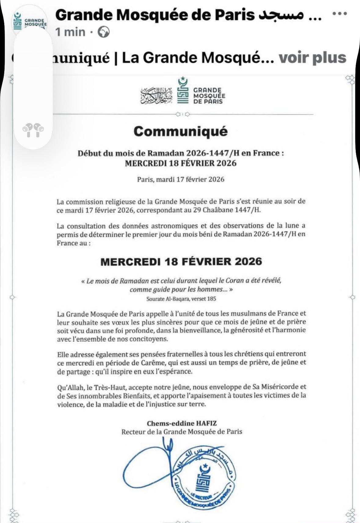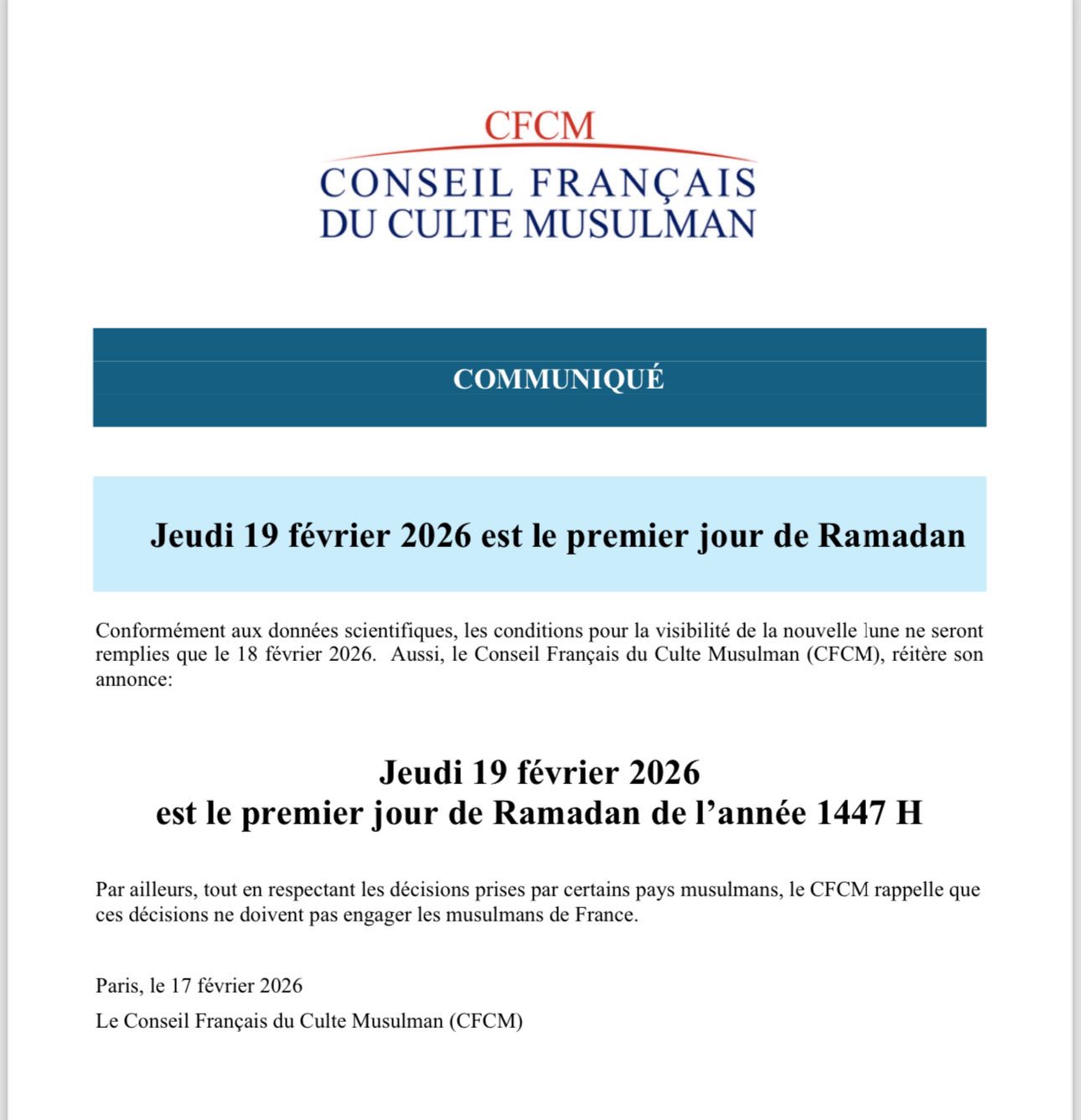 وأوضح المجلس الفرنسي للديانة الإسلامية (CFCM)، في بيان رسمي صدر بتاريخ 17 فبراير 2026، أن الخميس 19 فبراير هو أول أيام رمضان بناءً على البيانات العلمية التي تؤكد تعذر رؤية الهلال قبل مساء الأربعاء 18 فبراير. وشدد المجلس، الذي يضم في تركيبته نحو 2500 مسجد ومصلى ويستعين بخدمات "Météo France" لمراقبة الهلال، على أن القرارات التي تتخذها الدول الإسلامية الأخرى لا تلزم المسلمين المقيمين في فرنسا.