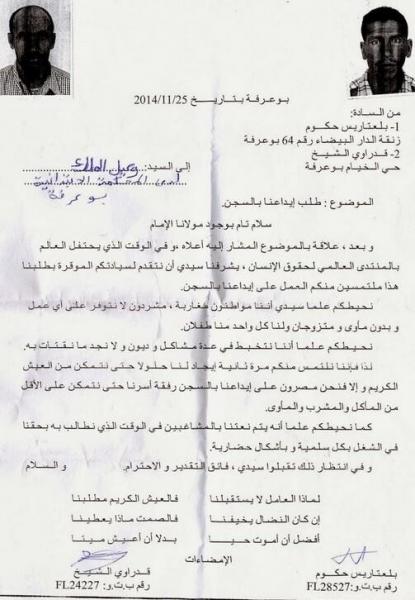 و قال المواطنان في رسالة وجهاها إلى وكيل الملك، :" في الوقت الذي يحتفل العالم بالمنتدى العالمي لحقوق الإنسان، يشرفنا سيدي أن نتقدم لسيادكم الموقرة بطلبنا هذا ملتمسين منكم العمل على إيداعنا بالسجن."