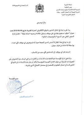 وفي إطار حق الرد الذي يكفله القانون وأخلاقيات المهنة، هذا هو النص الكامل للبلاغ كما توصلنا به: