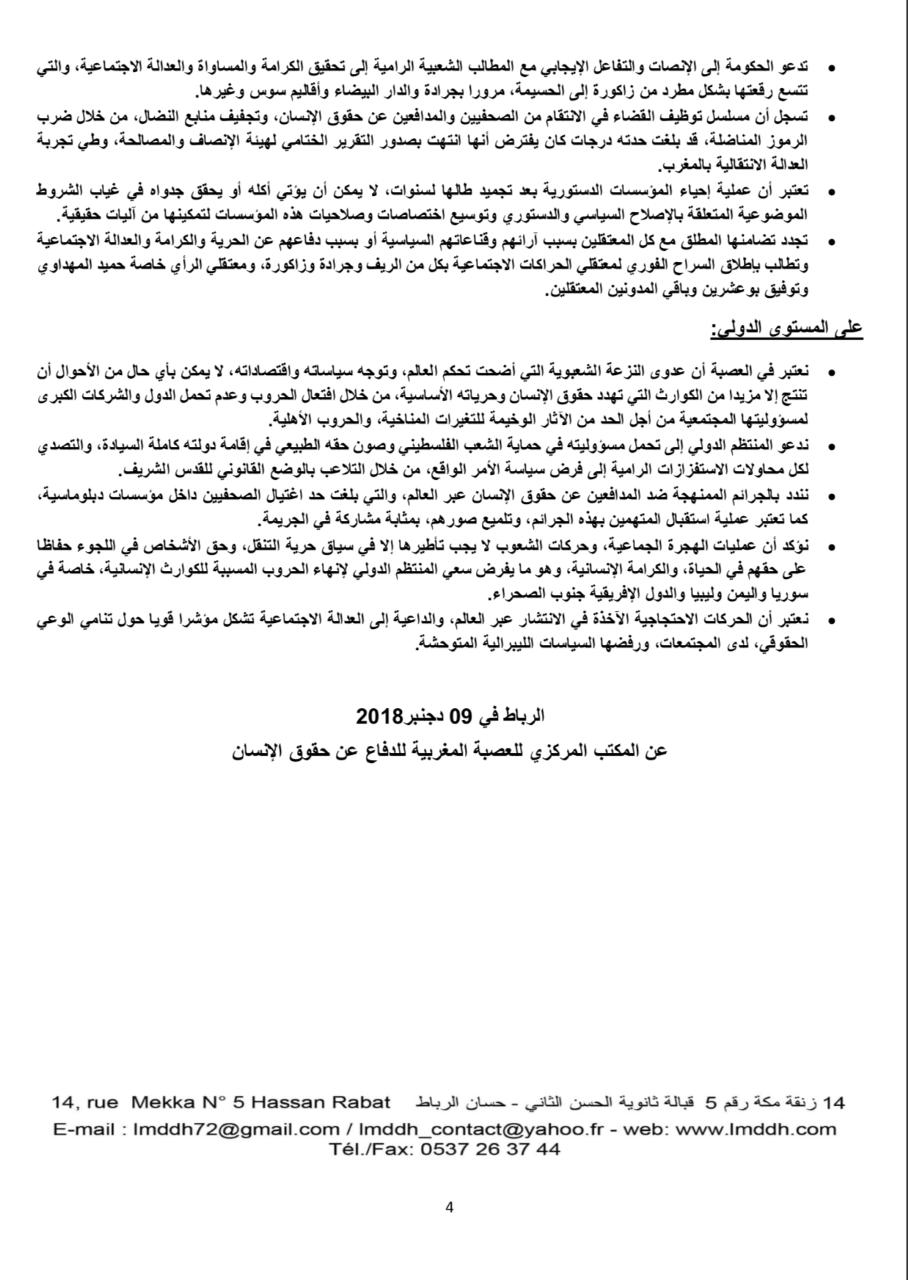 وبالمناسبة، أكدت العصبة أن اليوم العالمي لحقوق الإنسان والذي يصادف هذه السنة الذكرى الخامسة والعشرين لتوقيع الصيغة الأولى للميثاق الوطني لحقوق الإنسان، لتحيي نضالات الحركة الحقوقية عبر العالم، وفي المغرب على الخصوص، كما تجدد التأكيد على مواقفها الثابتة من مجمل القضايا الحقوقية الراهنة، والمتمثلة على الخصوص في :
