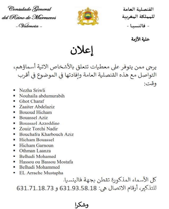 أصدرت القنصلية المغربية في فالنسيا نداءً عاجلاً للعثور على 16 مواطناً مغربياً يقيمون في المناطق المتضررة جراء الفيضانات الأخيرة، داعيةً كل من لديه معلومات عنهم إلى التواصل فوراً مع خلية الأزمة التي تم تشكيلها عقب الكارثة.
