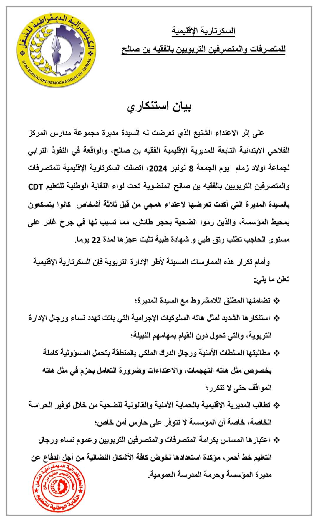 وعبرت السكرتارية الإقليمية، المنضوية تحت لواء النقابة الوطنية للتعليم (CDT)، عن تضامنها المطلق مع المديرة المعتدى عليها، مؤكدة وقوفها إلى جانبها في هذه المحنة الصعبة، كما استنكرت بشدة هذه السلوكيات الإجرامية التي أصبحت تشكل تهديداً لأطر الإدارة التربوية، وتعيقهم عن أداء مهامهم النبيلة التي تسعى لخدمة الصالح العام وتنمية المجال التربوي.