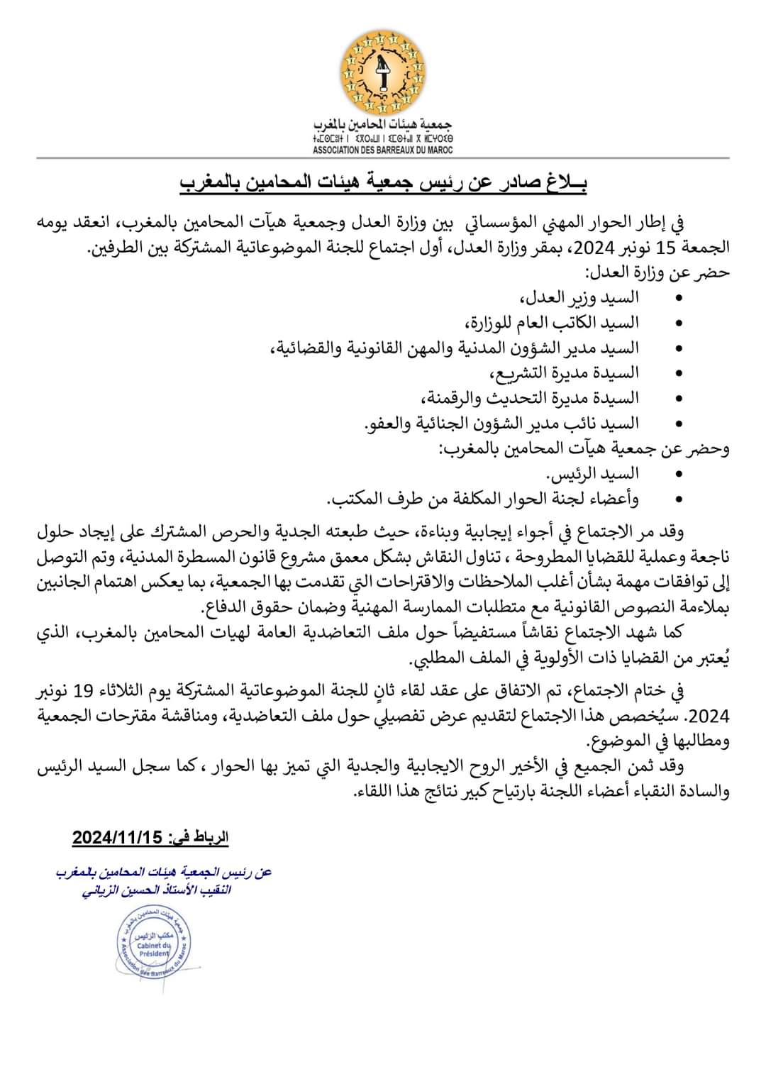 وتم الاتفاق على عقد اجتماع ثاني يوم 19 نونبر 2024 لمناقشة مقترحات الجمعية في هذا الملف، كما أن الطرفان أبديا التزاماً بتعزيز التعاون لتحقيق مصلحة المحاماة بالمغرب.