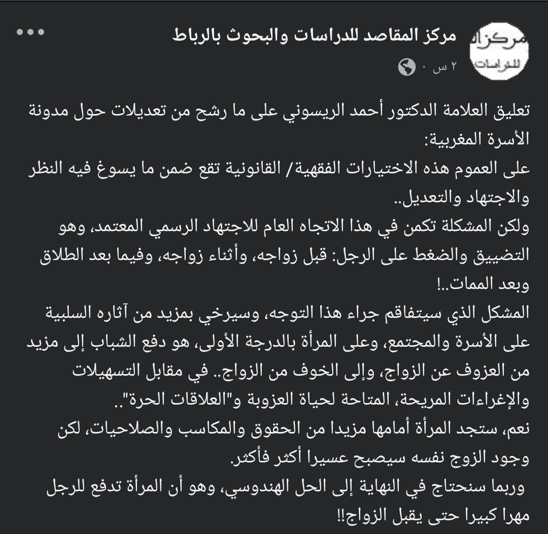 وأوضح الريسوني، في تصريحه الذي نشرته صفحة مركز المقاصد للدراسات والبحوث على فيسبوك، أن هذه التعديلات تقع ضمن نطاق الاجتهاد الفقهي والقانوني، لكنها قد تؤدي إلى تفاقم المشكلات الأسرية والاجتماعية، وخاصة بالنسبة للمرأة.