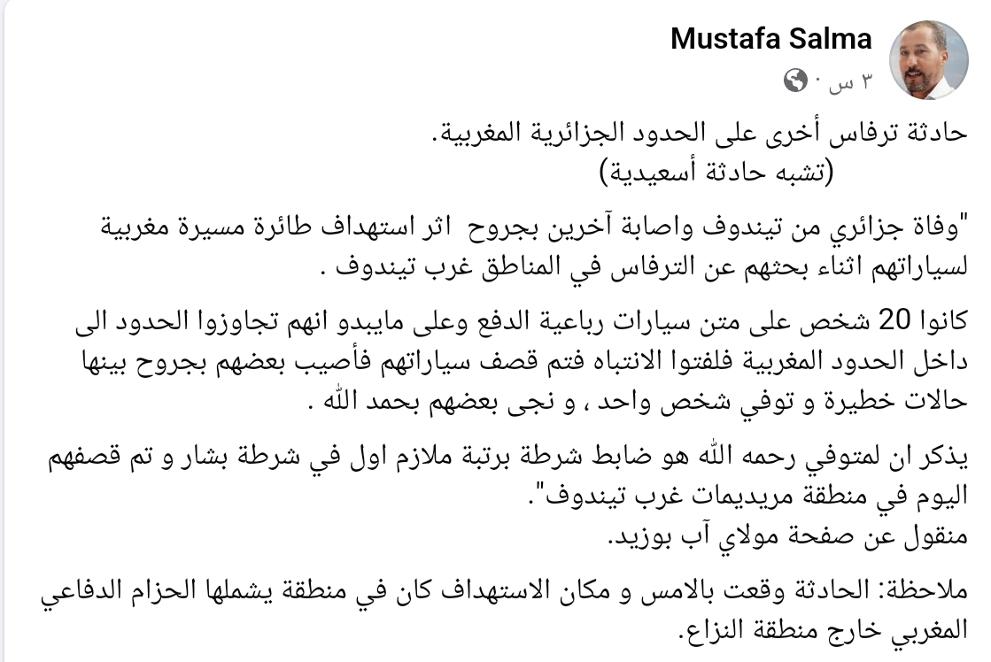 أكد الناشط الصحراوي مصطفى سلمى ولد سيدي مولود، أن القوات المسلحة الملكية أقدمت يوم أمس الخميس على توجيه ضربة مركزة عبر طائرة مسيرة، لتجمع من السيارات اقتحم الحدود المغربية غرب مدينة تندوف الجزائرية، وتحديدا بمنطقة مريديمات