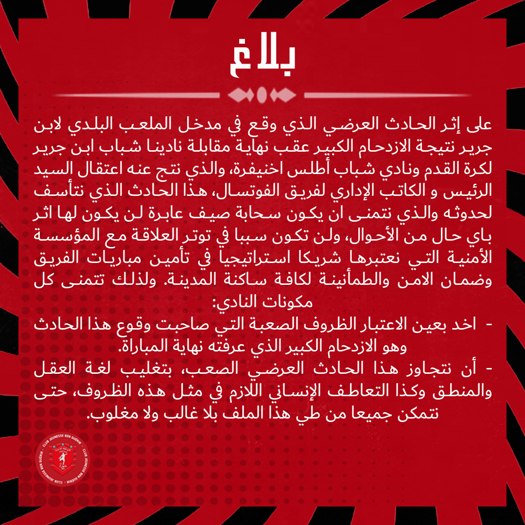 للإشارة، فقد أصدر المكتب المديري للنادي، بلاغًا أرجع فيه الحادث إلى الازدحام الكبير الذي وقع، مساء السبت، بمدخل الملعب البلدي بابن جرير عقب نهاية مقابلة الفريق ضد شباب أطلس خنيفرة. وأعرب البلاغ عن أسف النادي للحادث، معتبرًا إياه "سحابة صيف عابرة" لن يكون لها أي أثر سلبي على العلاقة مع المؤسسة الأمنية. كما دعا كل مكونات النادي إلى "الأخذ بعين الاعتبار الظروف الصعبة التي صاحبت وقوع هذا الحادث، والمتمثلة في الازدحام الكبير الذي عرفته نهاية المباراة"، كما دعاها إلى "تجاوز هذا الحادث العرضي الصعب، بتغليب لغة العقل والمنطق، وكذا التعاطف الإنساني اللازم في مثل هذه الظروف، حتى يتم طي هذا الملف بلا غالب ولا مغلوب"، حسب لغة بلاغ النادي.