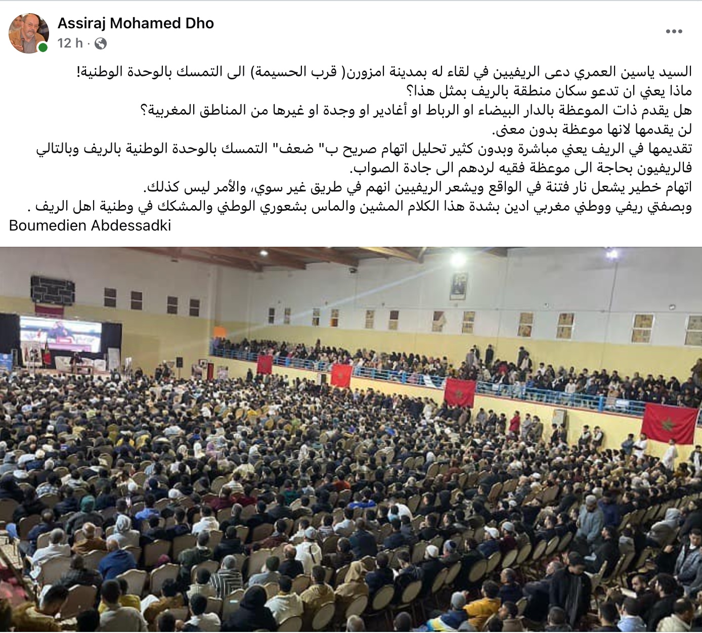 وأشار المتحدث ذاته إلى أن خطاب "العمري" تضمن "اتهاما خطيرا قد يشعل نار الفتنة، ويجعلنا نشعر وكأننا في طريق غير سوي، بينما الأمر ليس كذلك"، قبل أن يؤكد قائلا: "بصفتي ريفيًا ووطنيًا مغربيًا، أدين بشدة هذا الخطاب المشين الذي يمس شعورنا الوطني ويشكك في وطنية أهل الريف".