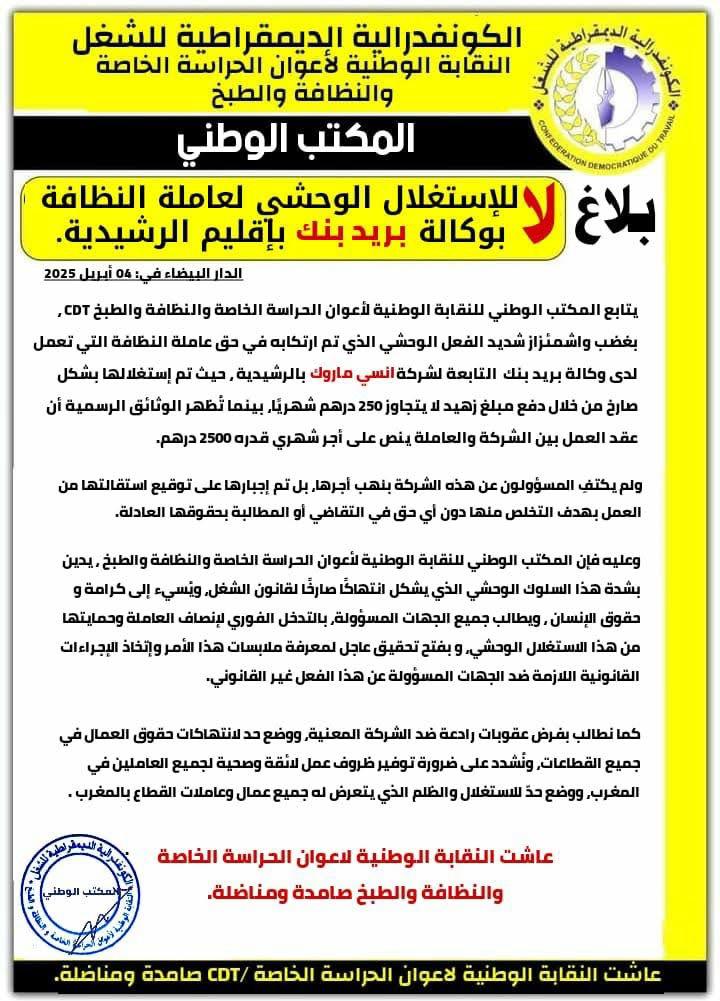 وفي هذا السياق، كشفت لبنى نجيب، الكاتبة الوطنية للنقابة الوطنية لأعوان الحراسة الخاصة والنظافة والطبخ، في تصريح لها، أن العاملة كانت مضطرة لتنظيف مكاتب ومرافق وكالة بريد المغرب ثلاث مرات أسبوعيًا، مقابل أجر شهري لا يتعدى 250 درهمًا فقط. وتساءلت: "كيف يتم احتساب هذا الأجر الهزيل؟ أين العدالة الاجتماعية وحقوق الإنسان؟ وأين ضمير المسؤولين؟".